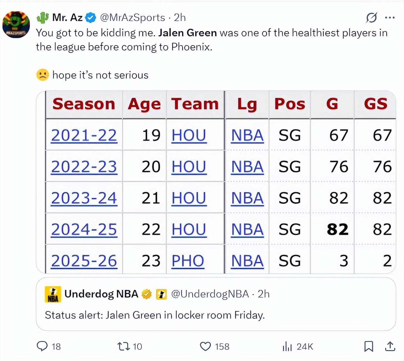 随后太阳官方宣布杰伦-格林因为腿筋伤势复发本场比赛不会回归,他本赛季合计才打四场比赛,而24-25赛季杰伦-格林常规赛打满82场,此前的四个赛季最少的一个赛季都能打67场,联盟又有一个铁人来到凤凰城后倒下了。