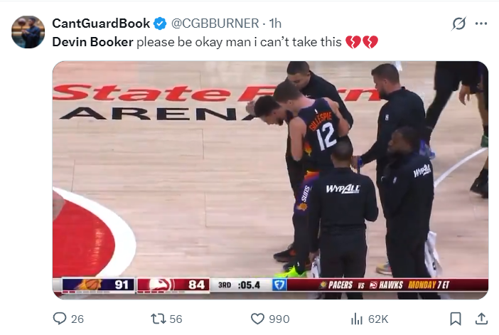 赛后太阳主帅乔丹-奥特谈到布克的伤势:我们都为他感到难过,他在比赛结束后是拄拐离开更衣室,球员通道通常都会准备这种拐杖以免让运动员受伤的脚再度负重。