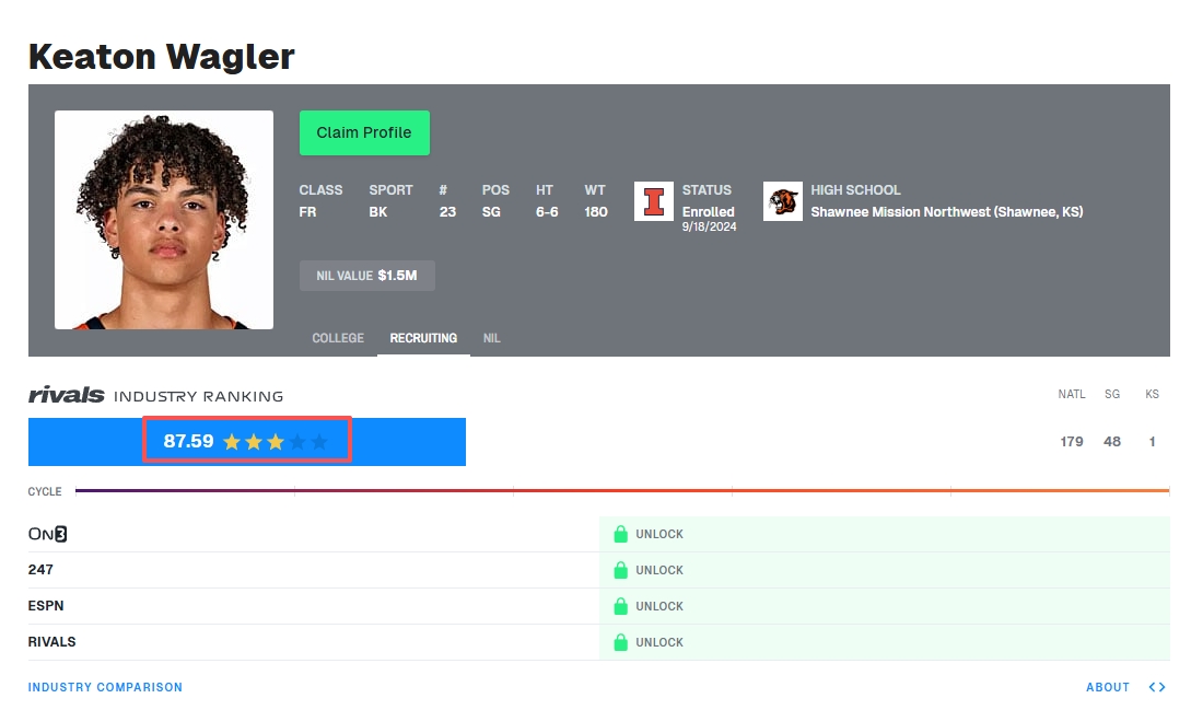 瓦格勒最初只是知名体育招募网站On3评选的三星高中生,但凭借自己的努力让选秀行情逐步走高,今年更是一度冲进了模拟选秀前五行列。本赛季,瓦格勒带领伊利诺伊大学打进疯三最终四强,成为自2005年德隆之后首位带领伊利诺伊进入最终四强的核心后卫。