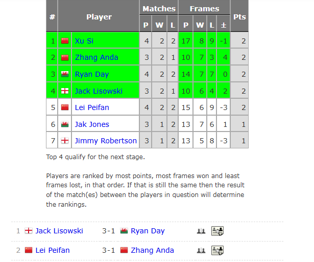 小组循环赛首个比赛日结束,徐思以4战2胜2负战绩,比较小分暂时排在第一位。国锦赛冠军张安达以3战2胜1负,暂时排在第二。接下来是瑞恩-戴、杰克-利索夫斯基、雷佩凡、杰克-琼斯、吉米-罗伯逊。今天的第七小组第二个比赛日,张安达、徐思、雷佩凡三位,谁会成为小组冠军呢?