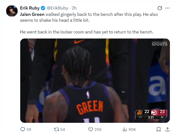 随后太阳官方宣布杰伦-格林因为腿筋伤势复发本场比赛不会回归,他本赛季合计才打四场比赛,而24-25赛季杰伦-格林常规赛打满82场,此前的四个赛季最少的一个赛季都能打67场,联盟又有一个铁人来到凤凰城后倒下了。