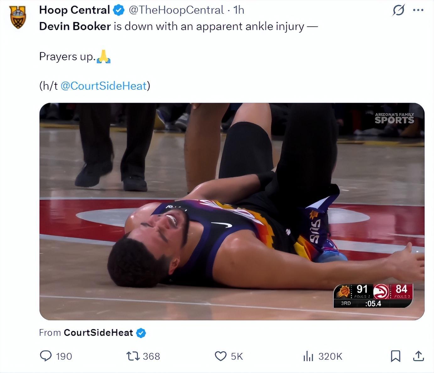 紧接着在第三节,德文-布克踩到了奥孔古的脚背,布克右脚踝有一个90度的扭曲,随后布克倒在地上捂着自己的脚踝呻吟,布克下场前太阳还领先7分。
